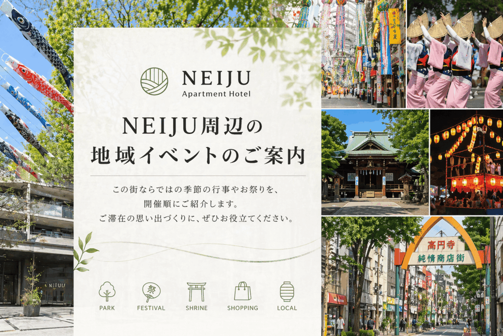 NEIJUの周辺には、地域に根ざしたお祭りや季節の行事があります。ご滞在の時期に合わせて、街の表情もあわせてお楽しみください。現時点で公式発表を確認できる主なイベントを、開催順にご案内します。なお、一部には開催時期のみ公開されているイベントも含まれます。内容は変更となる場合がありますので、お出かけ前に各主催者の最新情報をご確認ください。